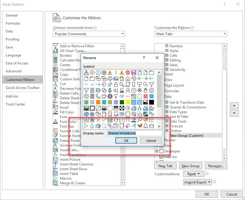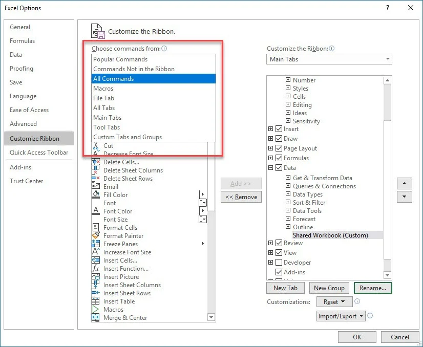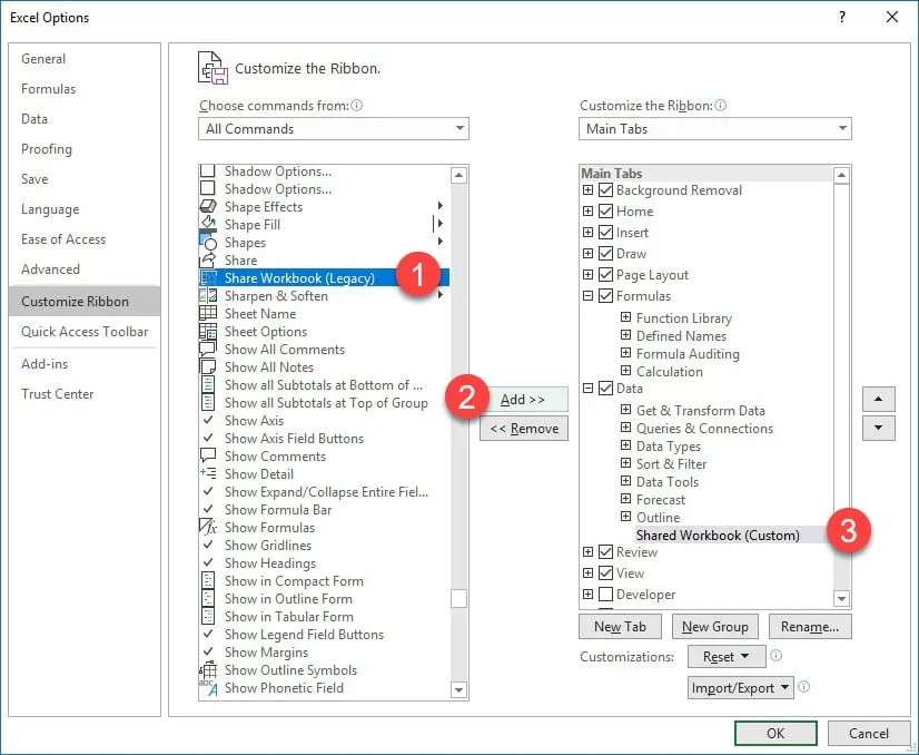 - From the long list of all commands at the left, navigate to the option named Share Workbook (Legacy). Then click the Add >> button from the middle. This will add that forgotten button to the group we had selected at the right.