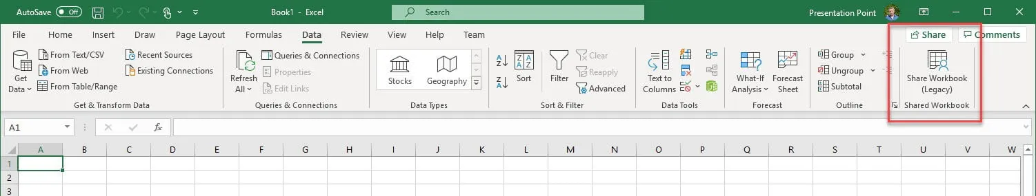 Click a few times OK to save all the changes. Then, at the Excel ribbon, click to open the Data option. You will find the newly added command named Share Workbook (Legacy) totally at the right of the ribbon.