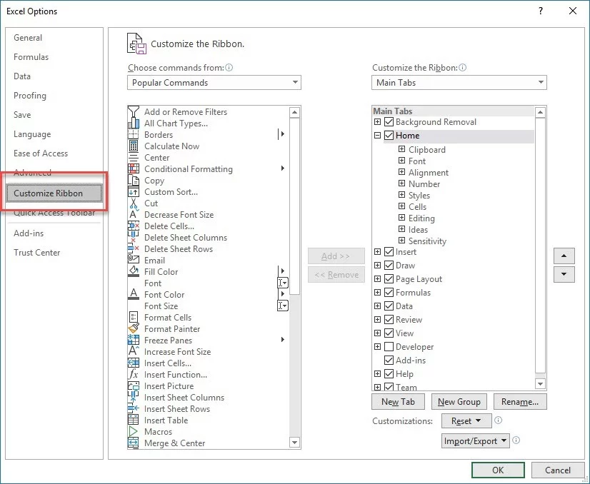 Since Excel 2016, this option was removed from the visible buttons by Microsoft. And we see the same happening with Office 365 and Office 2019.