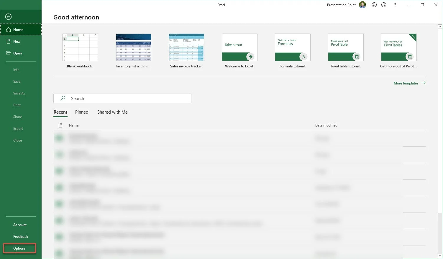 To add this Share workbook option back to the ribbon, click File and click Options.