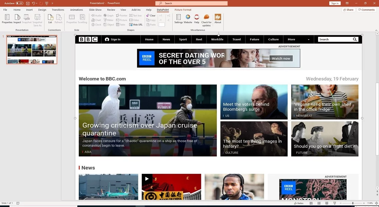 When done, the picture you had on your slide earlier, is replaced and is showing the capture of the website. You can resize the picture to whatever you need.