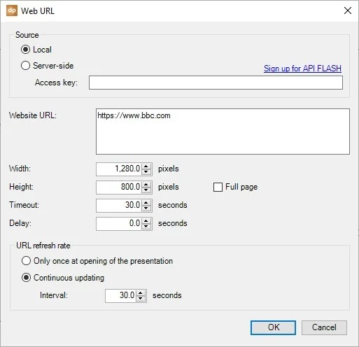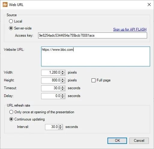 Set the Web URL source to server-side and paste your ApiFlash access key like so.
