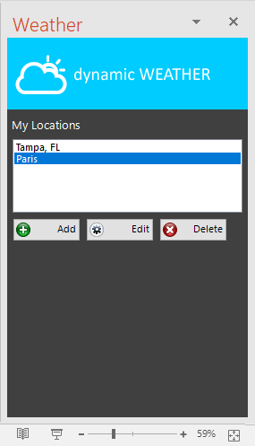 Click the Weather button to open the Dynamic Weather pane in PowerPoint.