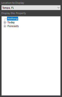 First, select the location for which you want to retrieve the information from. Then you can choose to display a weather property. All weather properties are grouped under Today and Forecasts.