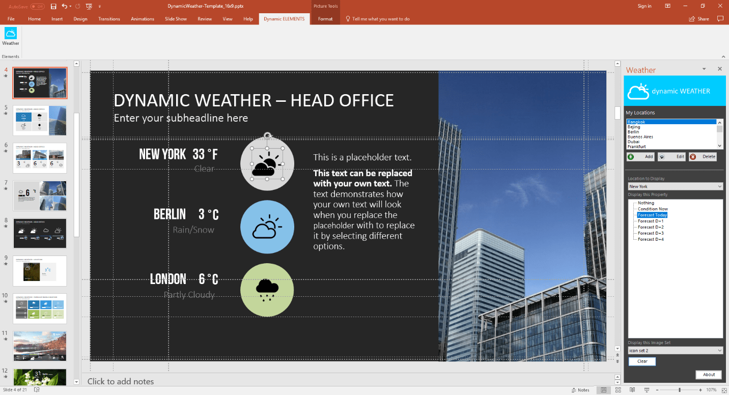 When done, restart your PowerPoint application and you will be able to choose between 5 weather icon sets now.